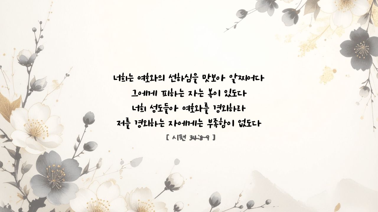 "너희는 여호와의 선하심을 맛보아 알찌어다 그에게 피하는 자는 복이 있도다 너희 성도들아 여호와를 경외하라 저를 경외하는 자에게는 부족함이 없도다" (시 34:8-9)