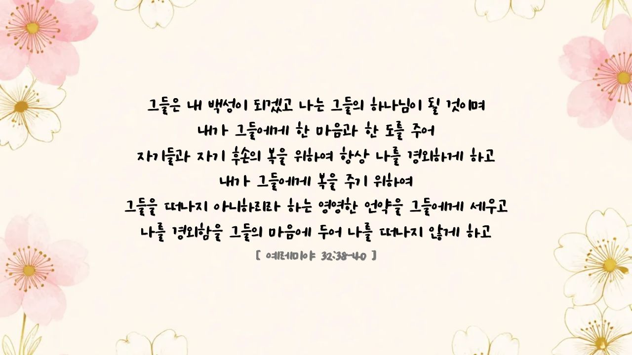 "그들은 내 백성이 되겠고 나는 그들의 하나님이 될 것이며 내가 그들에게 한 마음과 한 도를 주어 자기들과 자기 후손의 복을 위하여 항상 나를 경외하게 하고 내가 그들에게 복을 주기 위하여 그들을 떠나지 아니하리라 하는 영영한 언약을 그들에게 세우고 나를 경외함을 그들의 마음에 두어 나를 떠나지 않게 하고" (렘 32:38-40)