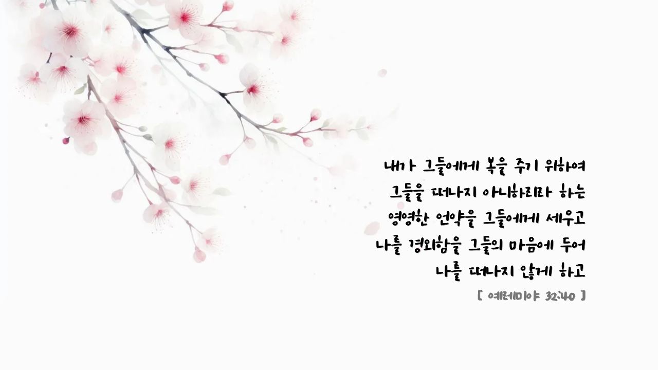 "내가 그들에게 복을 주기 위하여 그들을 떠나지 아니하리라 하는 영영한 언약을 그들에게 세우고 나를 경외함을 그들의 마음에 두어 나를 떠나지 않게 하고 내가 기쁨으로 그들에게 복을 주되 정녕히 나의 마음과 정신을 다하여 그들을 이 땅에 심으리라" (렘 32:40-41)