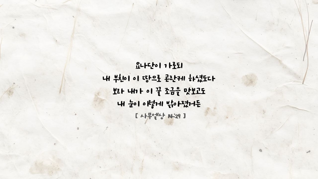 그런데 아버지 사울의 명령을 모르고 먼저 전쟁터에 나가 있던 요나단과 군사들은 수풀 속에 꿀이 있는 것을 보고 먹습니다.