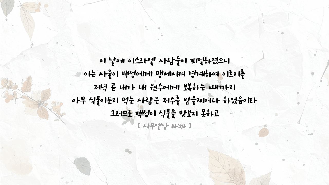 사무엘상 14:24절에 보면 어느 날 사울은 전쟁 중에 전쟁에 승리하기 위하여 하나님의 도우심을 바라는 금식을 전 병사들에게 명령합니다.