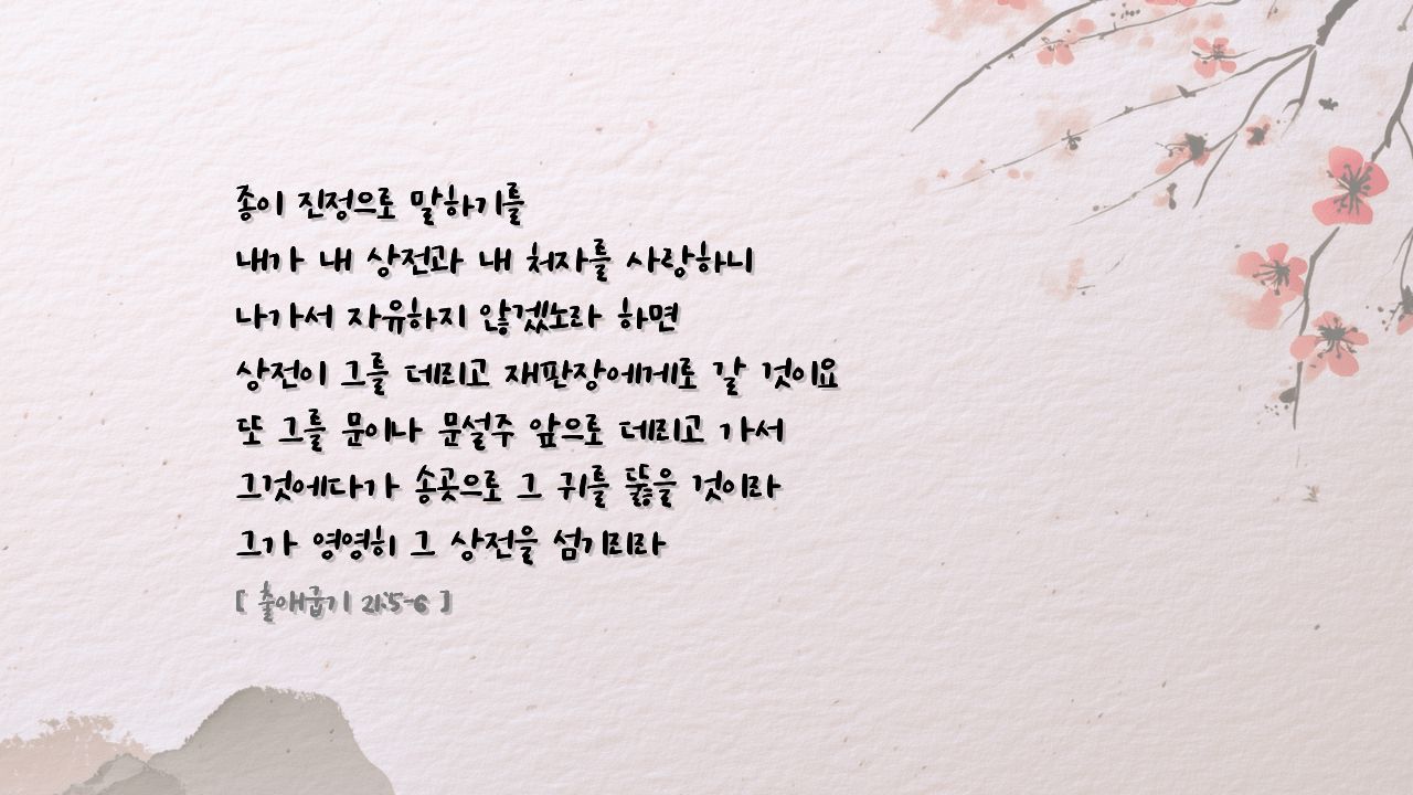 하나님은 우리에게 하나님의 은혜와 복과 선을 경험하게 하여 하나님 밖에 없다는 마음을 심어 주셔서 스스로 자원하여 하나님의 종이 되어 하나님을 경외하고 하나님을 섬기기를 원하십니다.