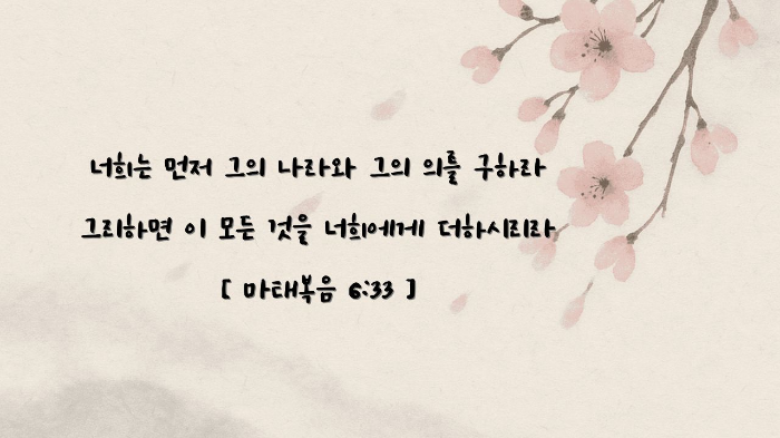 "그러므로 염려하여 이르기를 무엇을 먹을까 무엇을 마실까 무엇을 입을까 하지 말라 이는 다 이방인들이 구하는 것이라 너희 천부께서 이 모든 것이 너희에게 있어야 할 줄을 아시느니라 너희는 먼저 그의 나라와 그의 의를 구하라 그리하면 이 모든 것을 너희에게 더하시리라"