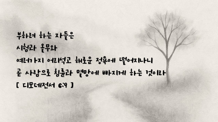 "부하려 하는 자들은 시험과 올무와 여러 가지 어리석고 해로운 정욕에 떨어지나니 곧 사람으로 침륜과 멸망에 빠지게 하는 것이라"