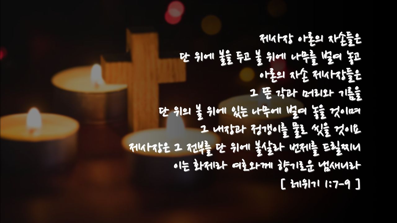한 주간의 상번제가 내일은 온전히 우리 모든 것을 하나님께 헌신하는 번제가 되어, 예배가 거룩한 향기가 되어 하나님께 올라가기를 기도합니다. 샬롬