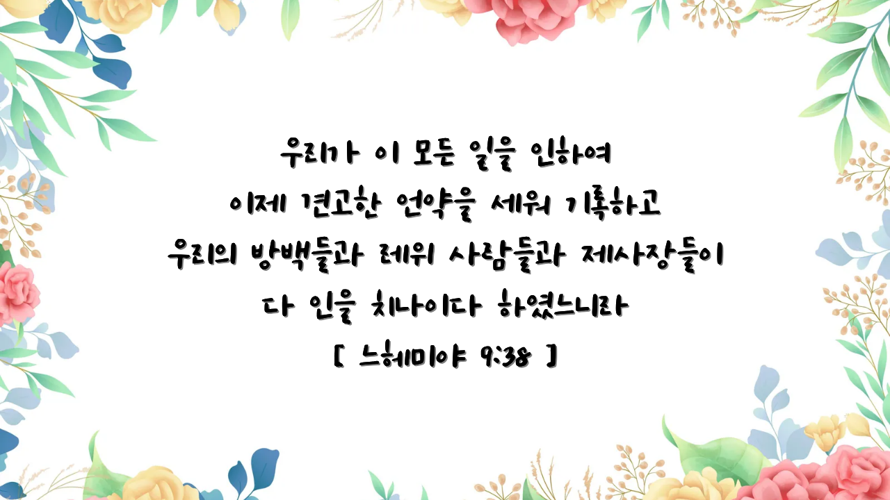 우리 하나님이여 광대하시고 능하시고 두려우시며 언약과 인자를 지키시는 하나님이여 우리와 우리 열왕과 방백들과 제사장들과 선지자들과 열조와 주의 모든 백성이 앗수르 열왕의 때로부터 오늘날까지 당한바 환난을 이제 작게 여기시지 마옵소서 그러나 우리의 당한 모든 일에 주는 공의로우시니 우리는 악을 행하였사오나 주는 진실히 행하셨음이니이다 우리 열왕과 방백들과 제사장들과 열조가 주의 율법을 지키지 아니하며 주의 명령과 주의 경계하신 말씀을 순종치 아니하고 저희가 그 나라와 주의 베푸신 큰 복과 자기 앞에 주신 넓고 기름진 땅을 누리면서도 주를 섬기지 아니하며 악행을 그치지 아니한고로 우리가 오늘날 종이 되었삽는데 곧 주께서 우리 열조에게 주사 그 실과를 먹고 그 아름다운 소산을 누리게 하신 땅에서 종이 되었나이다 우리의 죄로 인하여 주께서 우리 위에 세우신 이방 열왕이 이 땅의 많은 소산을 얻고 저희가 우리의 몸과 육축을 임의로 관할하오니 우리의 곤란이 심하오며 우리가 이 모든 일을 인하여 이제 견고한 언약을 세워 기록하고 우리의 방백들과 레위 사람들과 제사장들이 다 인을 치나이다 하였느니라 (느 9:32-38)