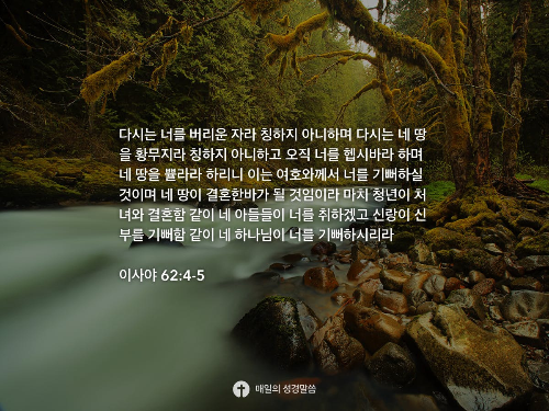 다시는 너를 버리운 자라 칭하지 아니하며 다시는 네 땅을 황무지라 칭하지 아니하고 오직 너를 헵시바라 하며 네 땅을 쁄라라 하리니 이는 여호와께서 너를 기뻐하실 것이며 네 땅이 결혼한바가 될 것임이라 (사 62:4)
