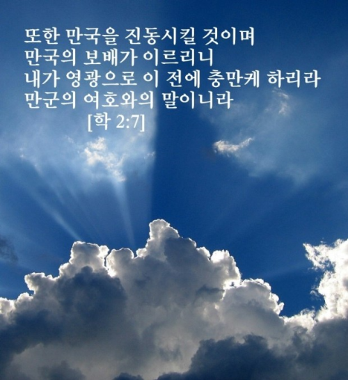 나 만군의 여호와가 말하노라 조금 있으면 내가 하늘과 땅과 바다와 육지를 진동시킬 것이요 또한 만국을 진동시킬 것이며 만국의 보배가 이르리니 내가 영광으로 이 전에 충만케 하리라 만군의 여호와의 말이니라 (학 2:6-7)