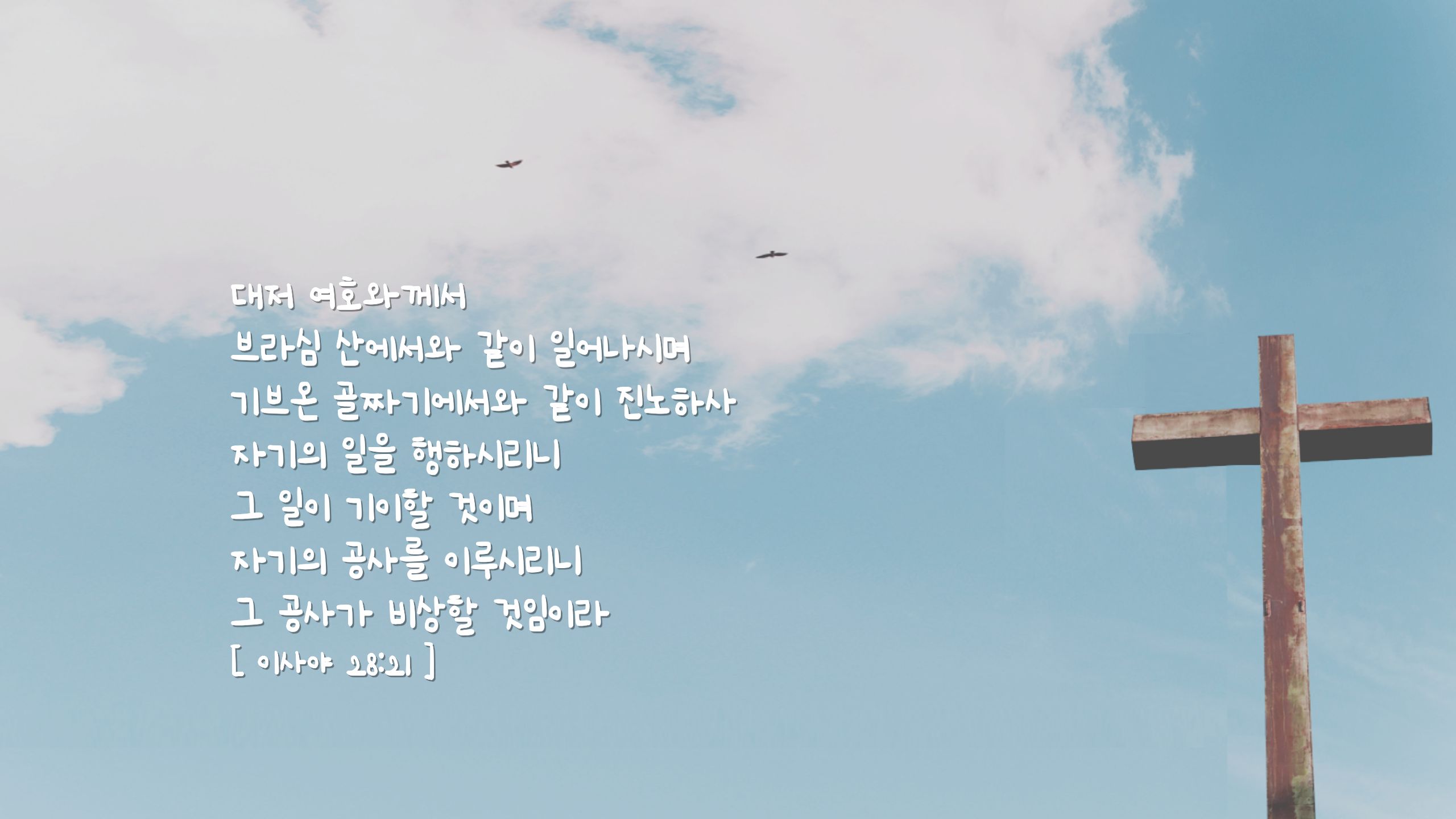 "대저 여호와께서 브라심 산에서와 같이 일어나시며 기브온 골짜기에서와 같이 진노하사 자기의 일을 행하시리니 그 일이 기이할 것이며 자기의 공사를 이루시리니 그 공사가 비상할 것임이라" 하십니다.