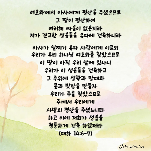 여호와께서 아사에게 평안을 주셨으므로 그 땅이 평안하여 여러해 싸움이 없은지라 저가 견고한 성읍들을 유다에 건축하니라 아사가 일찌기 유다 사람에게 이르되 우리가 우리 하나님 여호와를 찾았으므로 이 땅이 아직 우리 앞에 있나니 우리가 이 성읍들을 건축하고 그 주위에 성곽과 망대와 문과 빗장을 만들자 우리가 주를 찾았으므로 주께서 우리에게 사방의 평안을 주셨느니라 하고 이에 저희가 성읍을 형통하게 건축 하였더라 (대하 14:6-7)