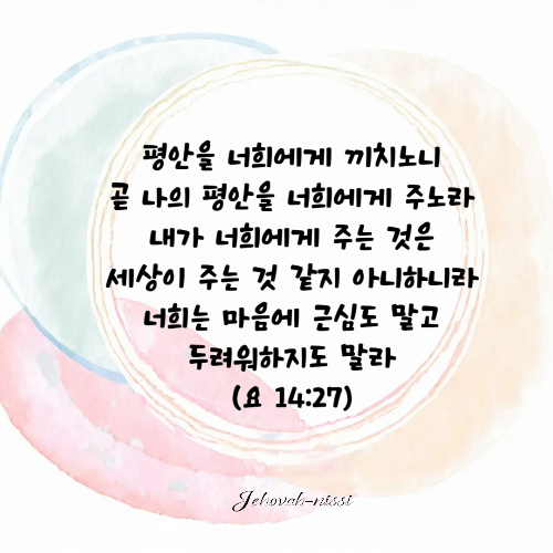 평안을 너희에게 끼치노니 곧 나의 평안을 너희에게 주노라 내가 너희에게 주는 것은 세상이 주는 것 같지 아니하니라 너희는 마음에 근심도 말고 두려워하지도 말라 (요 14:27)